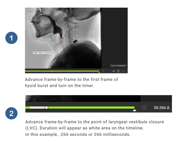 Time to LVC is measured by calculating the time between the first frame of hyoid burst and the first frame of laryngeal vestibule closure.