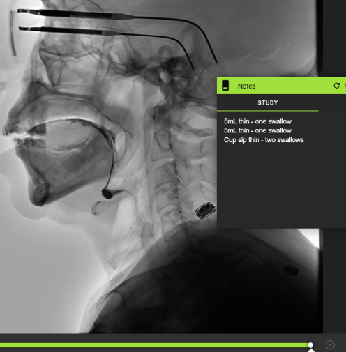 Example: Patient swallowed twice with cup sip thin independently. Data obtained with frame-by-frame review and detailed using the Notes tool.