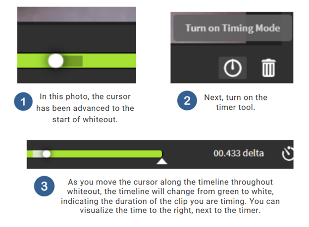 Time to whiteout can be calculated by starting the timer at the first frame after the endoscopist makes a statement regarding bolus presentation and timing until the first frame of complete whiteout.