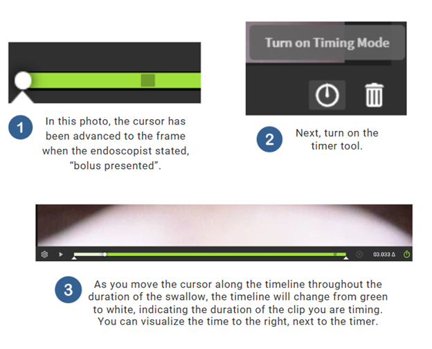 An example: The bolus is at the lips, and the endoscopist states, “thin liquid bolus presented now.” Reviewing frame-by-frame, the user would determine the first frame after the statement, until the first frame of complete whiteout.