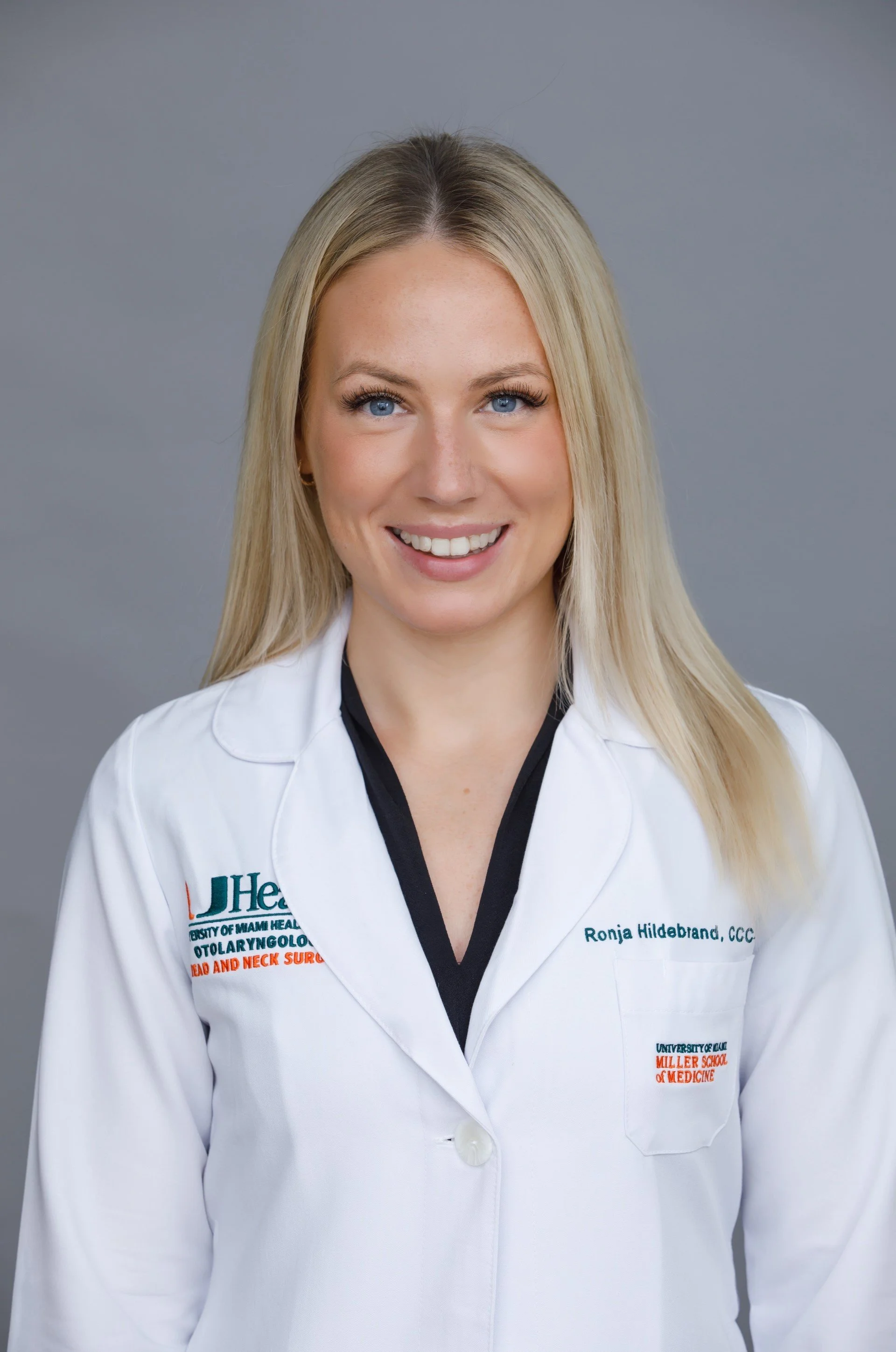 Ronja Hildebrand, M.A., CCC-SLP, CLT is a Speech Pathologist I in the Division of Speech Pathology in the Department of Otolaryngology at the University of Miami Miller School of Medicine. She specializes in the assessment and treatment of lymphedema, communication and swallowing disorders in the head and neck cancer population and provides acute care services to a variety of medical diagnoses.
